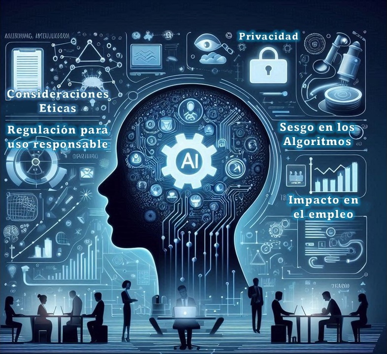 El desarrollo y la implementación de la IA plantean varios desafíos y consideraciones éticas, tales como la privacidad, el sesgo en los algoritmos, el impacto en el empleo (necesidad de capacitación continua para los empleados) y la necesidad de regulación adecuada para asegurar que la IA se utilice de manera responsable.